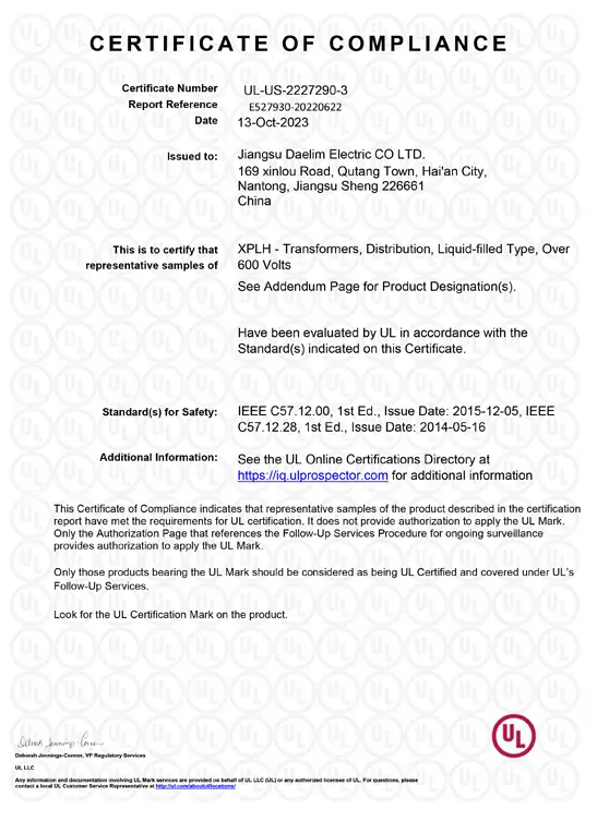 Daelim Transformer is a professional manufacturer of transformers with extensive project experience in North America. Our team is proficient in IEEE, CSA, DOE, NEMA, and other standards, as well as local laws and regulations. We export thousands of transformers to North America every year. Daelim’s UL-listed transformers are up to 44kV, making us the transformer manufacturer with the most UL certificates in China.